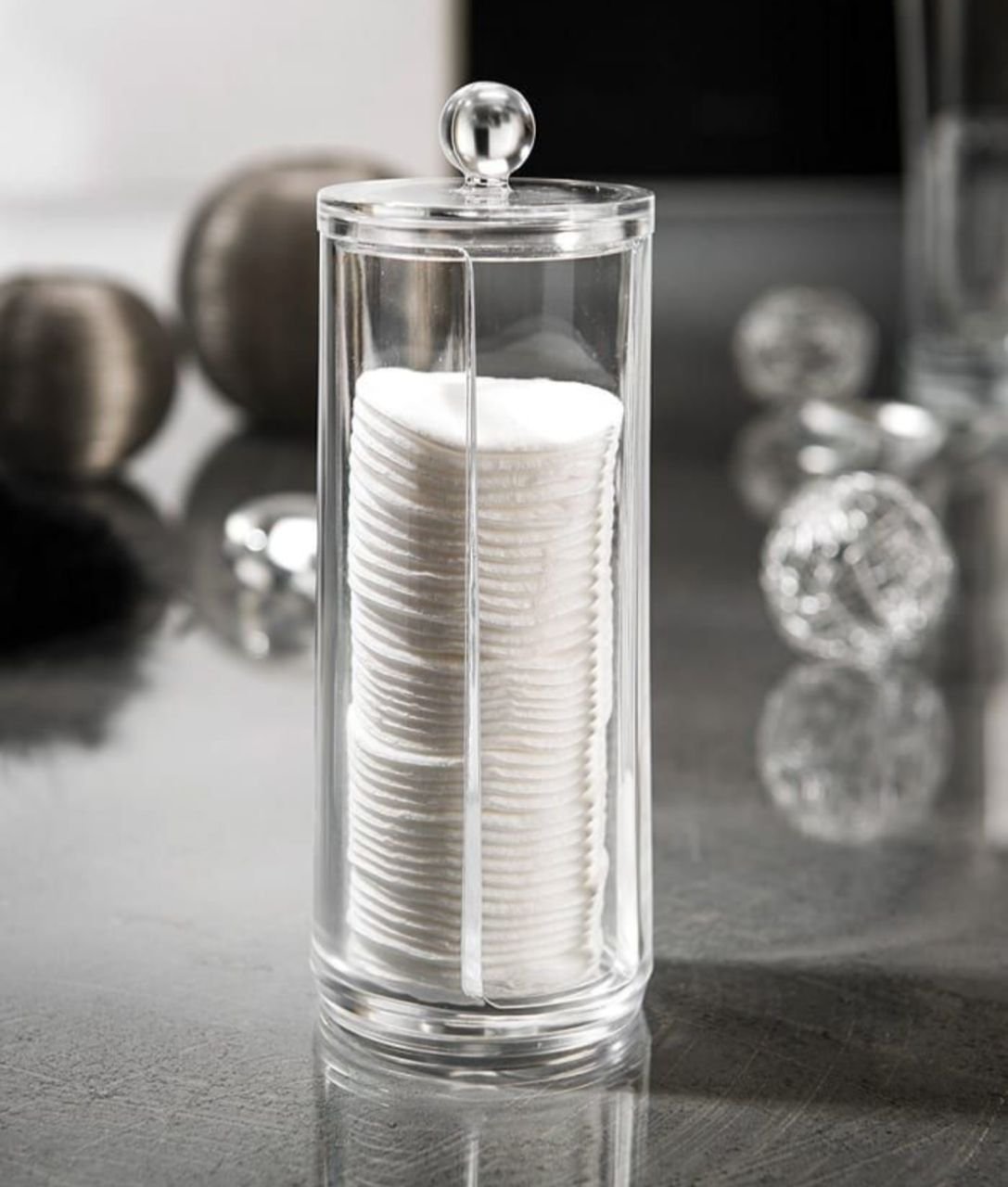 This sleek acrylic dispenser is designed to neatly store and display cotton pads in a modern, hygienic way. The transparent cylinder makes it easy to monitor the remaining pads, while the top lid with a round knob keeps them protected from dust. Its vertical design saves space and adds a stylish touch to any bathroom, vanity, or skincare station—perfect for daily makeup removal and skincare routines.