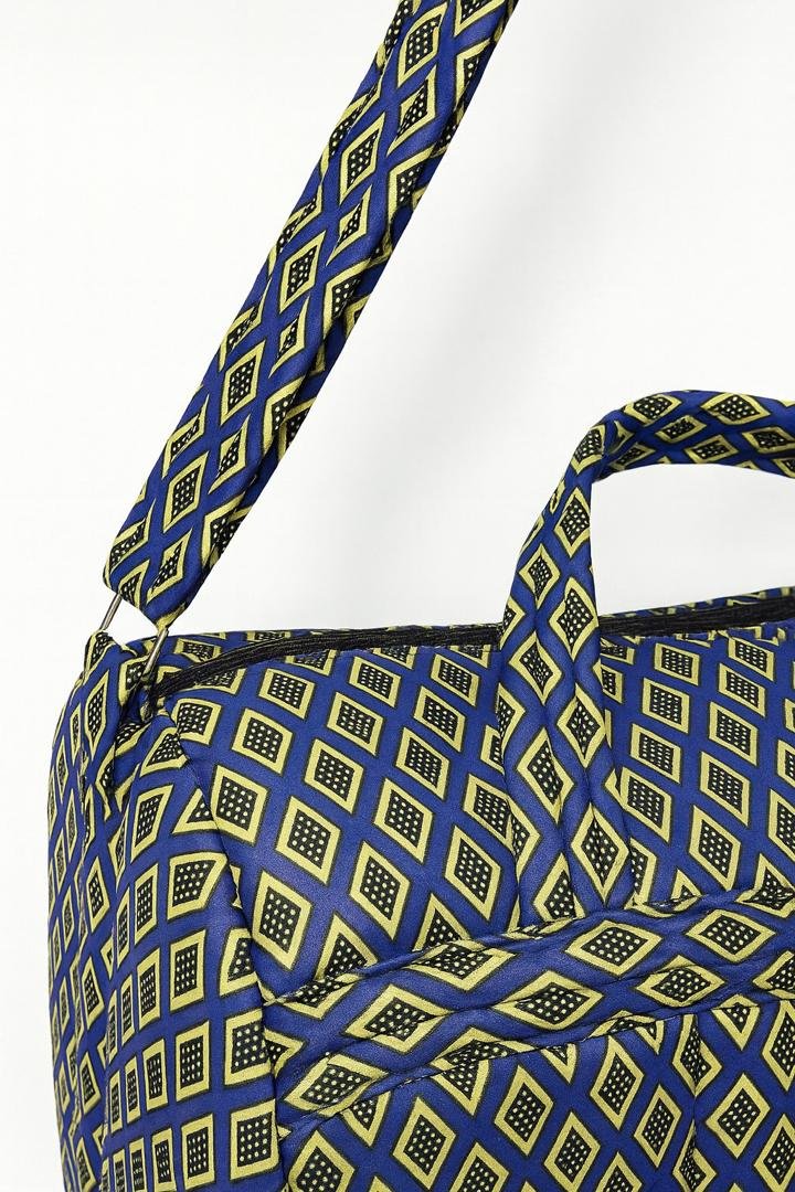 Travel smart and stylish with this Ankara-print duffel bag featuring bold blue and yellow diamond patterns. Made from durable African wax fabric, this bag offers both strength and cultural flair.