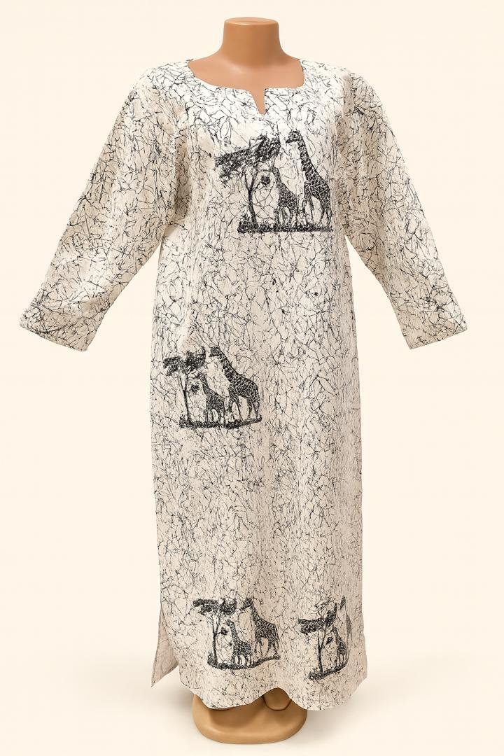 This stunning African safari-inspired kaftan features a unique black giraffe and tree print on a crisp white background, bringing a touch of nature and culture to your wardrobe. Designed in a free-size silhouette, it offers comfort and elegance for all body shapes. The dress includes long sleeves, a soft round neckline with a small V-cut, and side slits for ease of movement.
