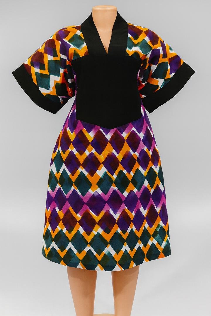 Bring life and color to your wardrobe with this stunning African Ankara short dress, featuring a vibrant diamond-pattern design in shades of purple, orange, teal, and yellow. The bold print is beautifully balanced by a solid black front panel and sleeve cuffs, adding a touch of elegance to the playful design.