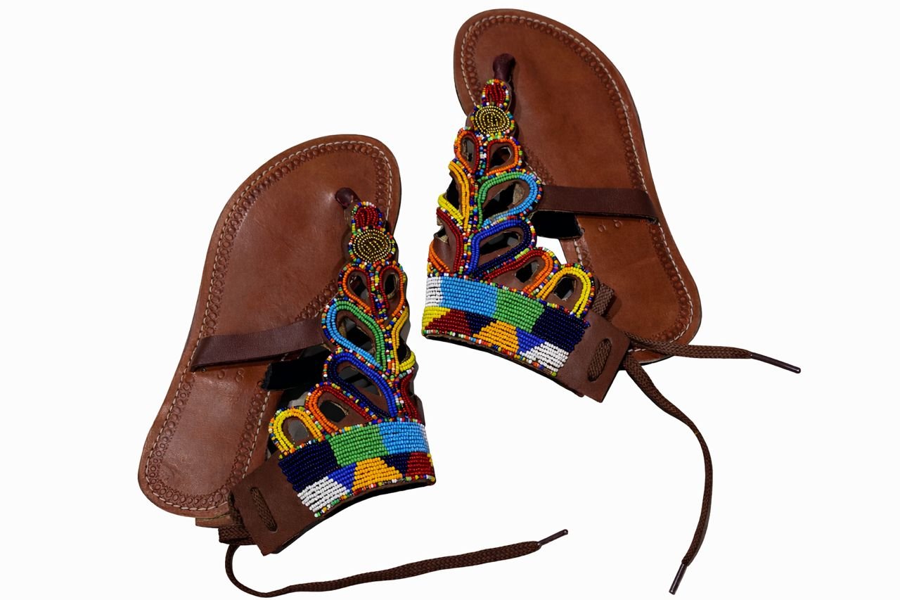 Elegant handcrafted leather sandals featuring vibrant, intricate beadwork that wraps beautifully around the ankle. Designed with a comfortable flat sole and secure lace-up fit, these sandals add a bold, cultural statement to both casual and dressed-up looks. Perfect for everyday wear or special occasions.