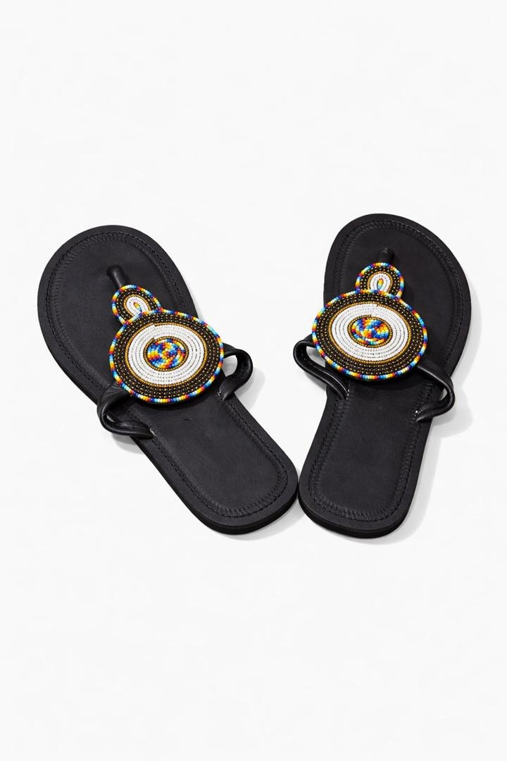 Chic black flat sandals highlighted with eye-catching circular beadwork in vibrant multicolor patterns. Handcrafted with a comfortable sole and sleek straps, perfect for adding a stylish artistic touch to everyday outfits.