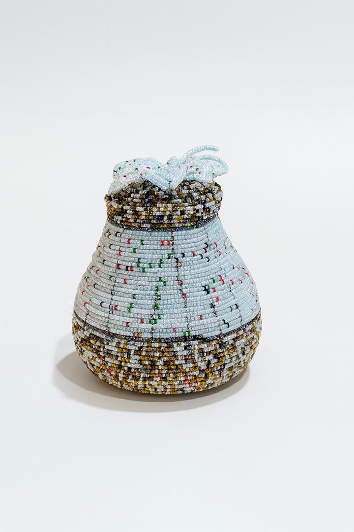 A stunning handcrafted beaded basket showcasing intricate artistry and vibrant detail. Designed with multicolored glass beads in earthy and pastel tones, it features a removable lid and elegant rounded form — perfect as a unique home accent or cultural centerpiece that celebrates traditional African craftsmanship.