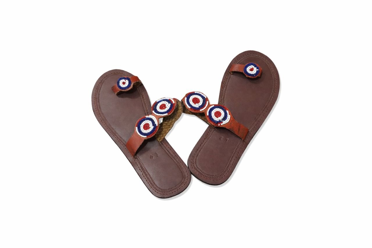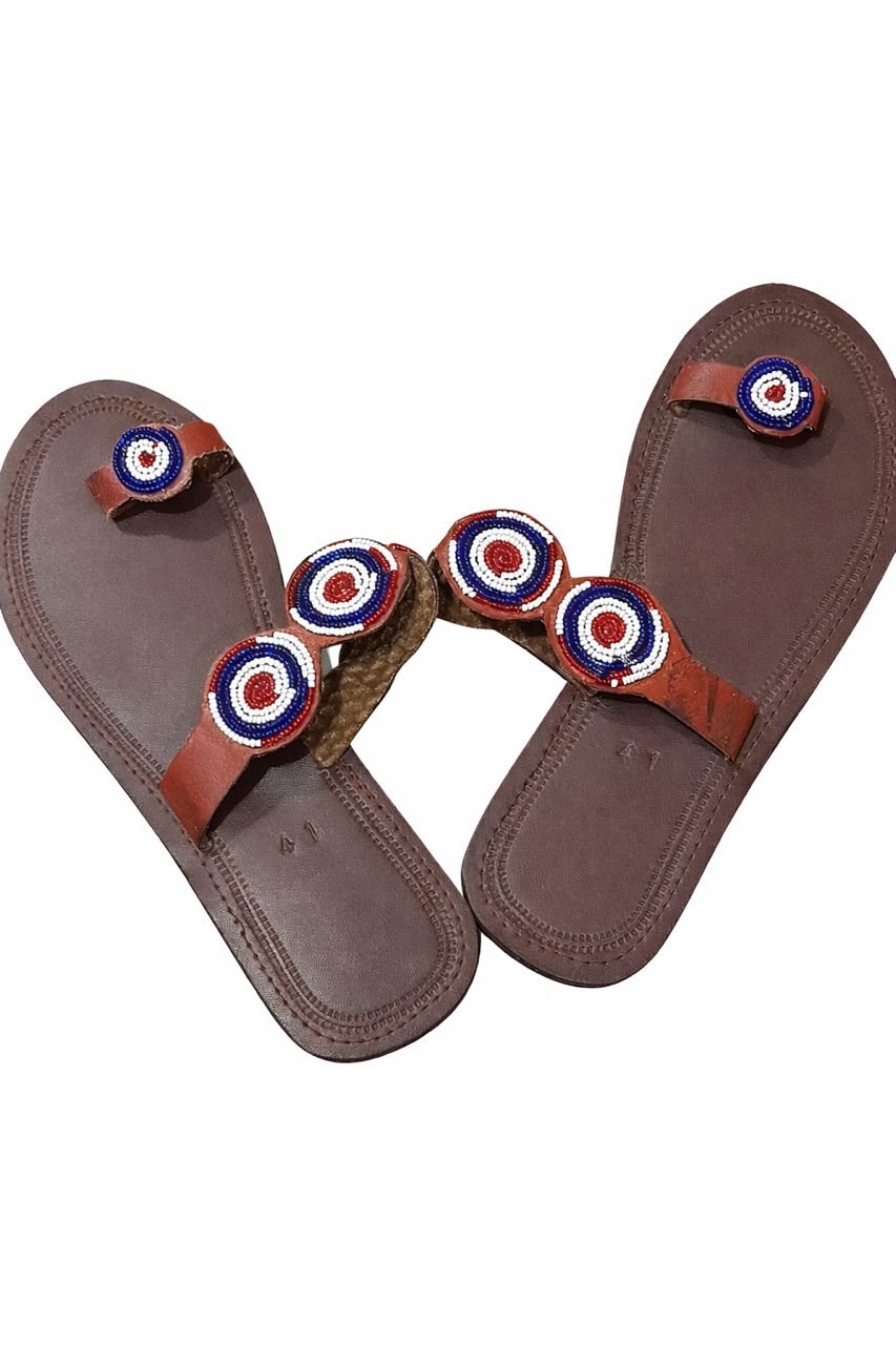 Handcrafted brown leather sandals featuring vibrant red, white, and blue beaded details. Designed for everyday comfort with a timeless, artisan finish—perfect for casual and cultural wear.