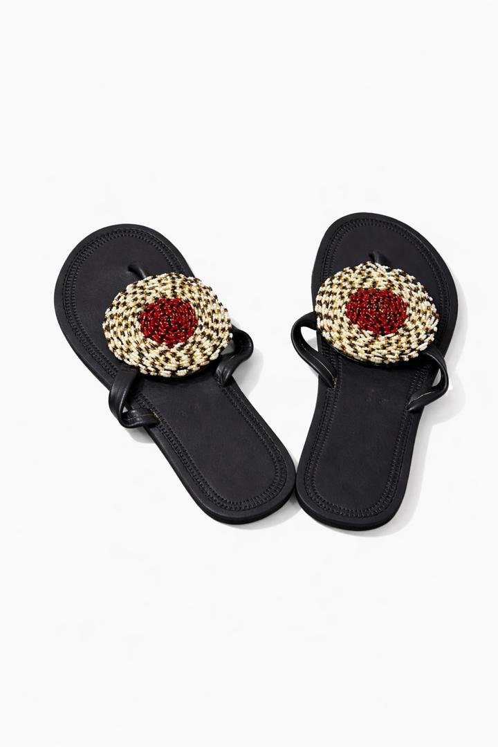 Elegant black flat sandals featuring bold circular beadwork with a rich red center and woven white accents. Handcrafted for comfort and style, these sandals add a refined artistic touch to everyday wear.