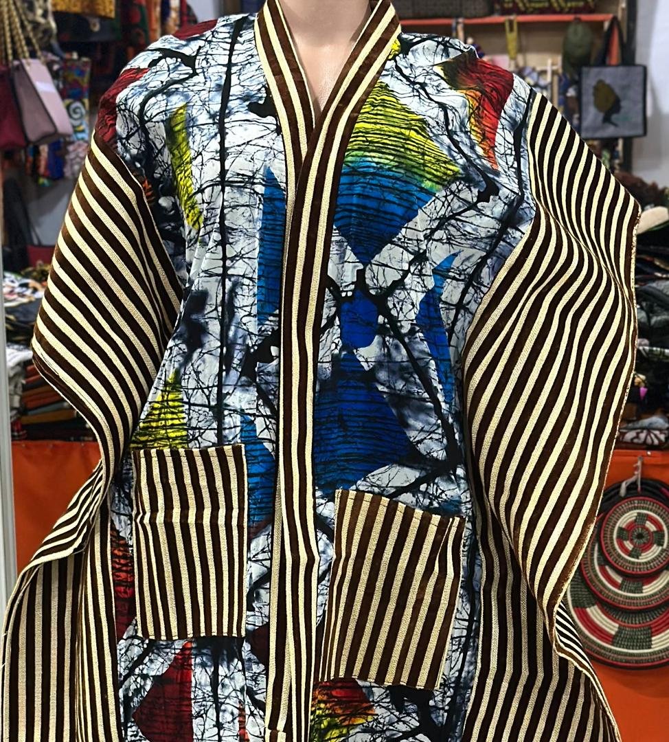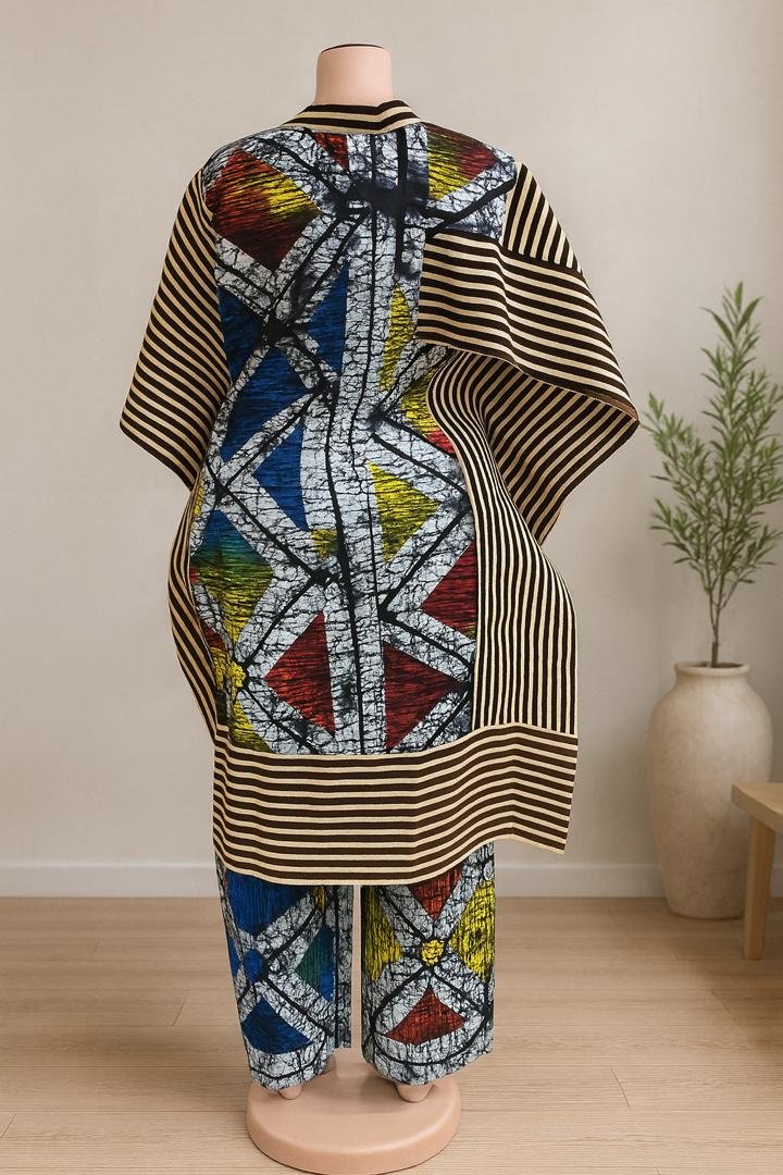 Step into culture and color with this eye-catching two-piece African set. Featuring a structured tunic top with wide striped sleeves and matching straight-leg pants, this ensemble blends bold abstract patterns in blue, red, yellow, and white with traditional striping. Designed for comfort and statement style, it’s perfect for cultural events, fashion-forward days, or elegant lounging. The relaxed fit and vivid print make this set a standout in any wardrobe.