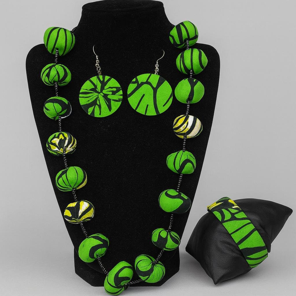 A vibrant fusion of culture and style — this handcrafted set features a statement necklace, round earrings, and a matching bracelet wrapped in bright green kitenge fabric with black, yellow, and white patterns. Perfect for adding a lively African touch to any outfit.