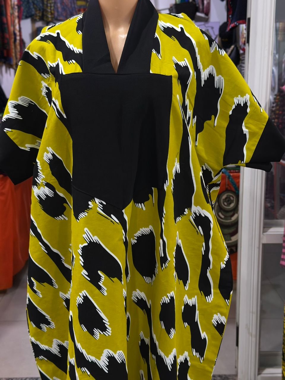 Make a striking statement with this vibrant yellow kaftan, featuring an eye-catching black and white abstract print. Crafted for comfort and elegance, this full-length kaftan offers a flowy silhouette perfect for any body type, making it ideal for both casual wear and special occasions.