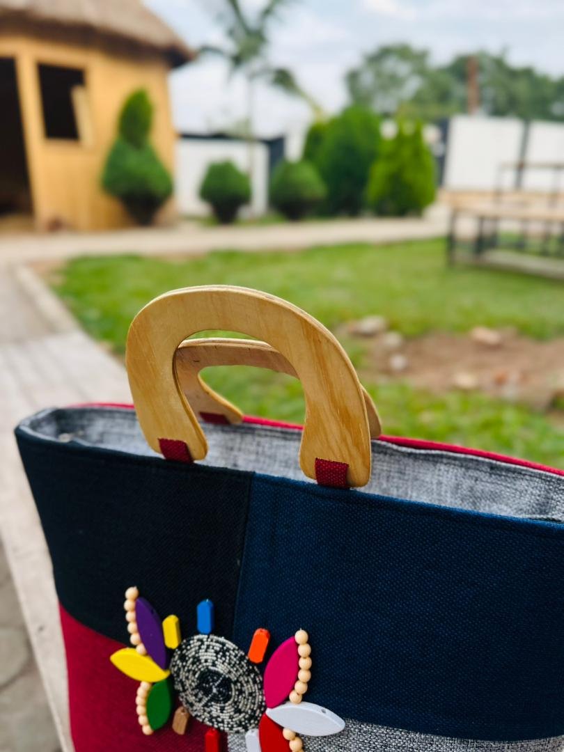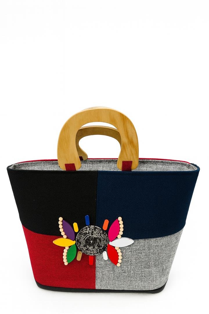 A chic color-block handbag featuring bold black, red, navy, and grey panels. Designed with a smooth wooden handle and finished with a vibrant beaded flower accent, this stylish piece adds a fun pop of color to any outfit. Perfect for modern, confident fashion lovers!