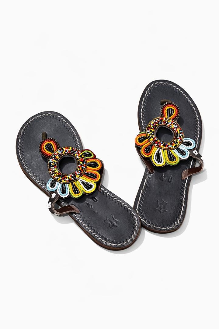 Black handcrafted flat sandals featuring vibrant multicolor floral beadwork with a bold circular center. Comfortable, artistic, and perfect for adding a pop of color to everyday outfits.