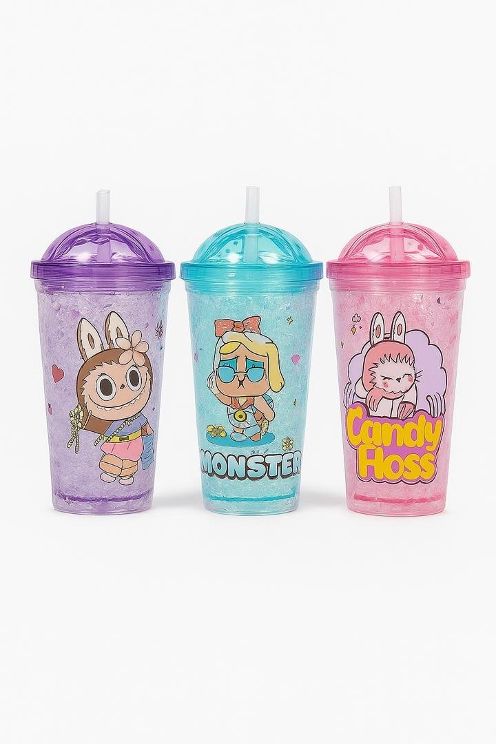 available in purple, blue, and pink with fun cartoon designs. Double-wall freeze gel keeps drinks colder for longer. Comes with a dome lid and straw—perfect for kids and everyday use.”