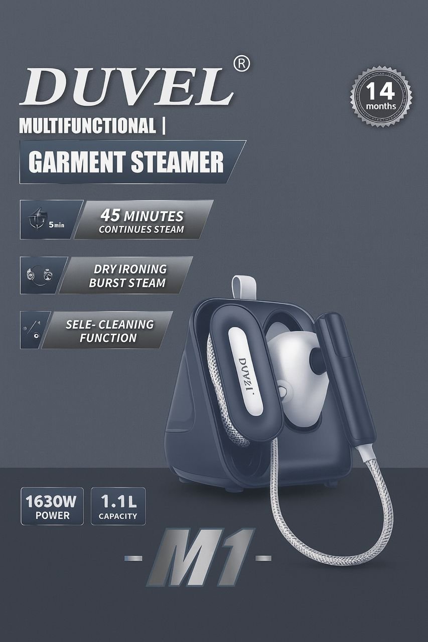 Experience fast, powerful wrinkle removal with the Duvel M1 Garment Steamer. Designed with a high-temperature 140°C steam output and continuous 45-minute performance, it smooths all fabrics with ease. Its dry-ironing burst mode tackles stubborn creases, while the self-cleaning function keeps the system fresh and long-lasting. Perfect for everyday wear, delicate fabrics, and quick refreshes.