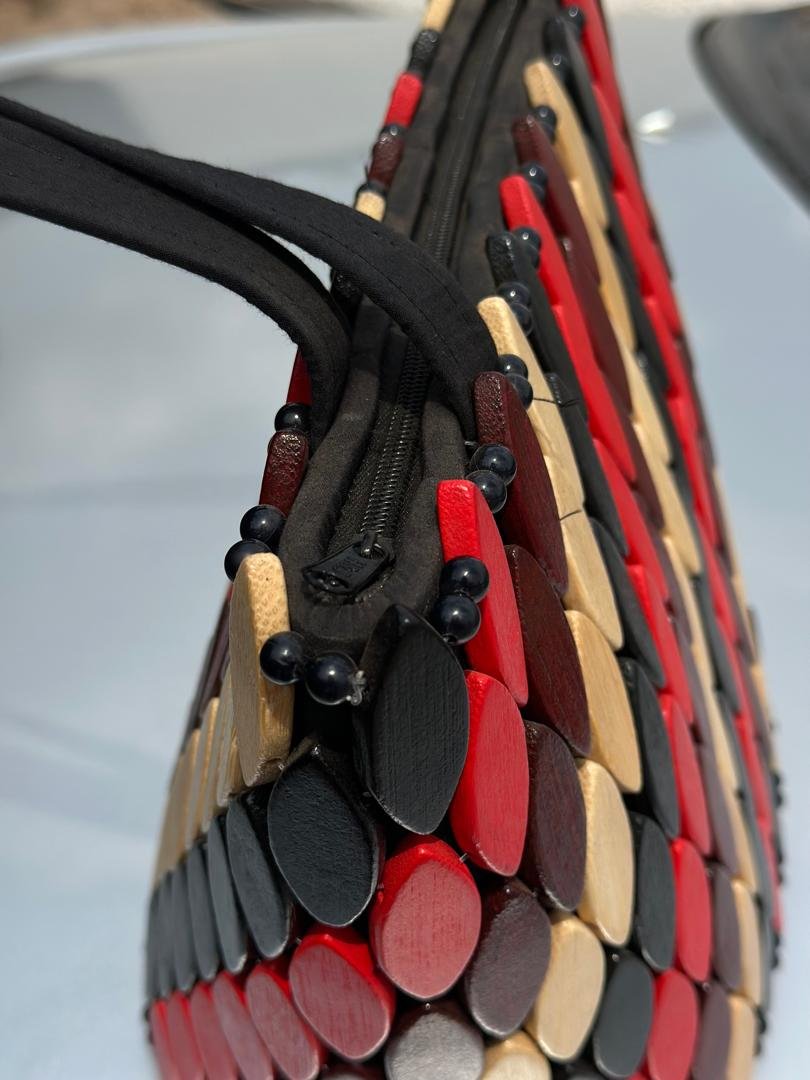 Add a touch of artistry to your outfit with this handcrafted wooden bead tote bag, designed to showcase both elegance and cultural craftsmanship. Featuring a stunning diamond-pattern design made from natural, red, black, and brown polished wooden pieces, this bag combines traditional African creativity with a modern aesthetic. Its sturdy structure and spacious interior make it perfect for daily use, travel, or special occasions. Lightweight yet durable, this bag is a unique fashion statement that celebrates natural materials and skilled handwork.