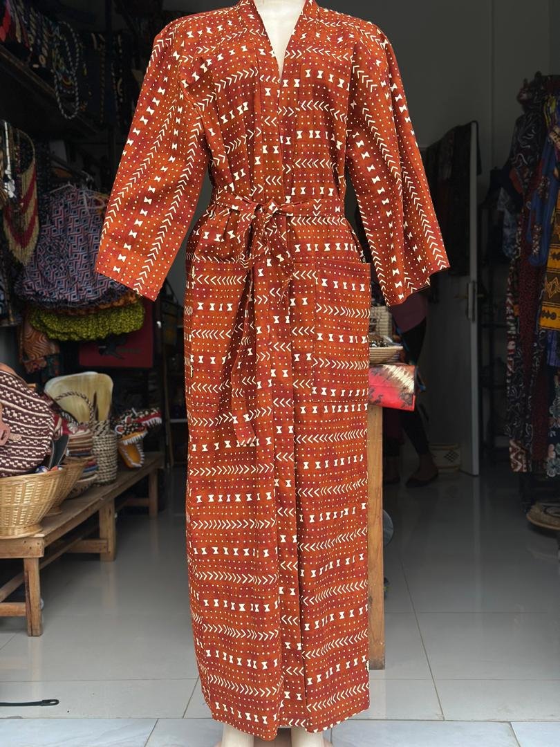 Add a touch of effortless elegance to your wardrobe with this African Print Long Kimono, featuring a rich brown base with white geometric tribal patterns. Crafted from lightweight, breathable fabric, this open-front kimono drapes beautifully, offering comfort and style in equal measure.
