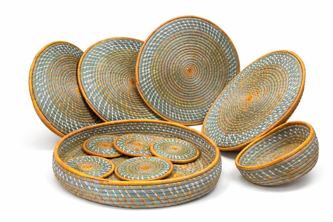 Beautifully handcrafted from natural fibers, this elegant set features matching baskets and coasters with soft green, white, and golden accents. Perfect for serving, organizing, or décor—adding a warm, artisanal touch to any space.