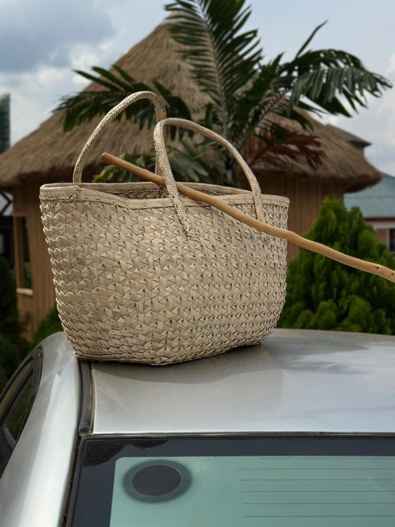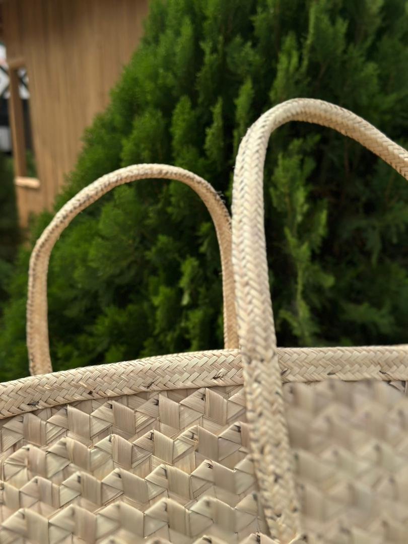 Bring effortless elegance to your everyday look with this Handwoven Palm Leaf Tote Bag, crafted from 100% natural materials. The detailed basket-weave design showcases exceptional craftsmanship and durability while maintaining a light, airy feel. Its neutral beige tone makes it a timeless accessory suitable for any outfit. With sturdy handles and a spacious interior, this bag is perfect for beach days, markets, picnics, or daily errands, blending eco-friendly design with classic style.