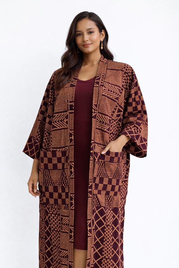 This elegant Kitenge kimono features a rich burgundy base adorned with intricate geometric patterns in warm earthy tones. Crafted from traditional African kitenge fabric, it blends cultural artistry with a modern, relaxed silhouette. The open-front design, wide three-quarter sleeves, and practical side pockets make it both stylish and comfortable.