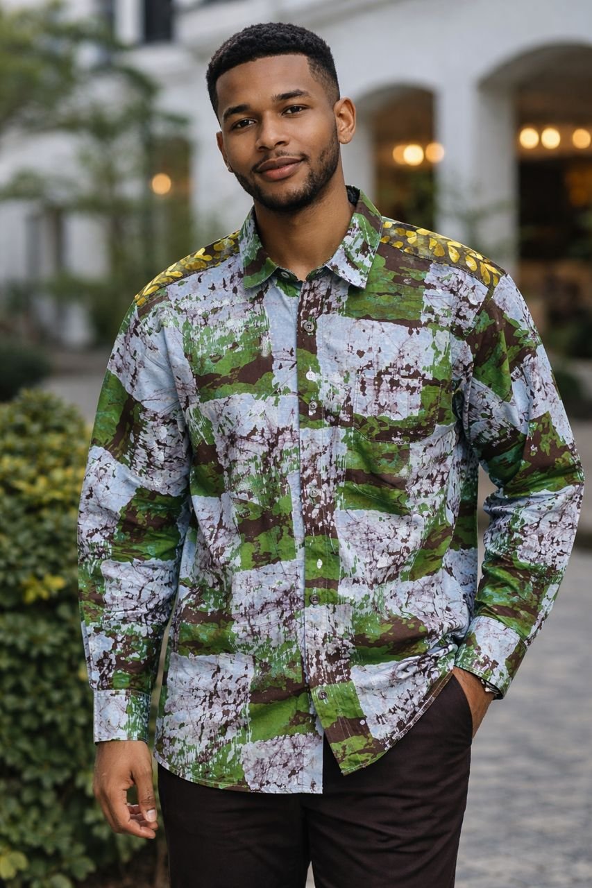 Crafted from premium kitenge fabric, this short-sleeve shirt features a bold abstract blend of green, brown, and soft blue tones. Modern, breathable, and effortlessly stylish—made to stand out with refined African elegance.