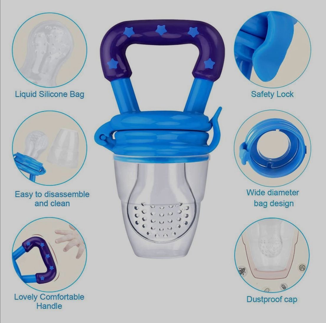 The image displays a baby silicone fruit feeder (also known as a nibbler, pacifier, or teether). This product is designed to allow babies to safely enjoy fresh fruits and vegetables without the risk of choking.