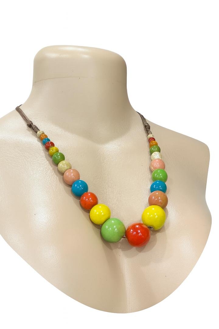 Bright, bold, and beautifully handcrafted, this necklace features a stunning mix of glossy ceramic beads in vibrant rainbow colors. Each bead is uniquely smooth and shiny, creating a joyful blend of yellow, red, green, blue, and warm earthy tones. Strung on durable cord for a natural, artisanal finish, this piece adds a playful pop of color to any outfit.