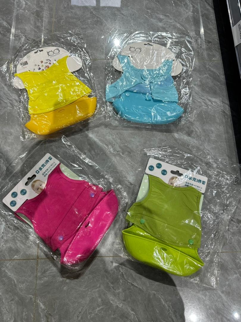 Waterproof, easy to clean, and designed with a deep food-catching pocket. Available in bright colors (yellow, blue, pink, and green). Soft, flexible, and perfect for messy meals.