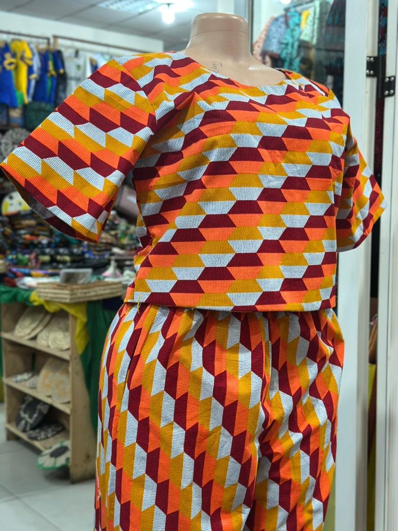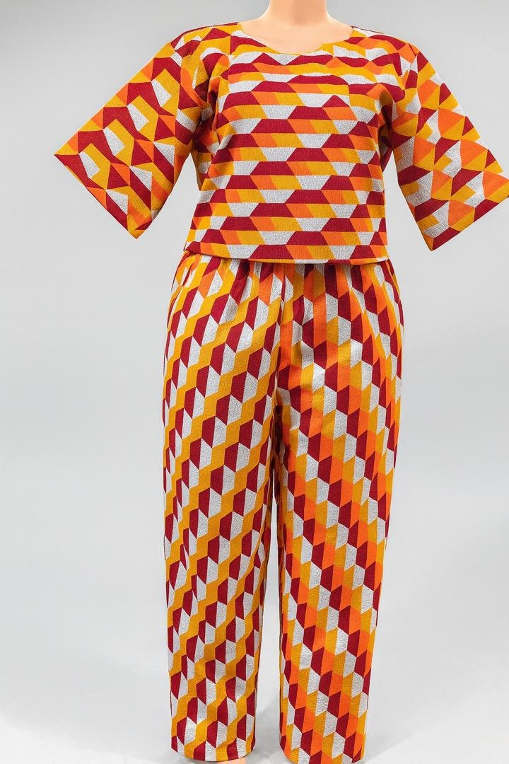 Vibrant African-inspired two-piece set featuring a short-sleeve top and high-waist pants with a bold red, yellow, and white geometric print. Made from lightweight cotton fabric, it offers a comfortable fit and eye-catching style — perfect for casual wear, events, or cultural occasions.
