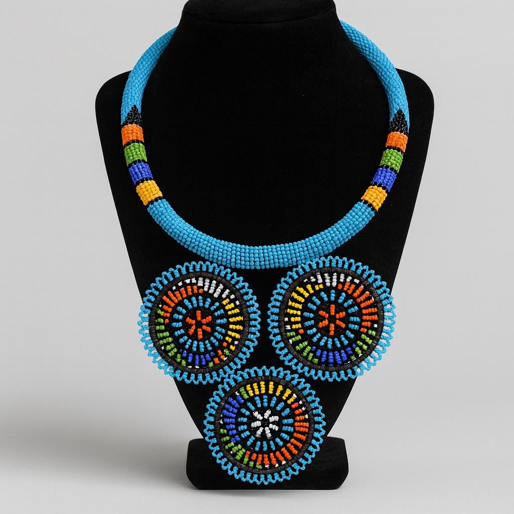 A bold handcrafted piece featuring three circular beaded pendants in vibrant colors, beautifully set on a turquoise base — a stunning symbol of African artistry and elegance.
