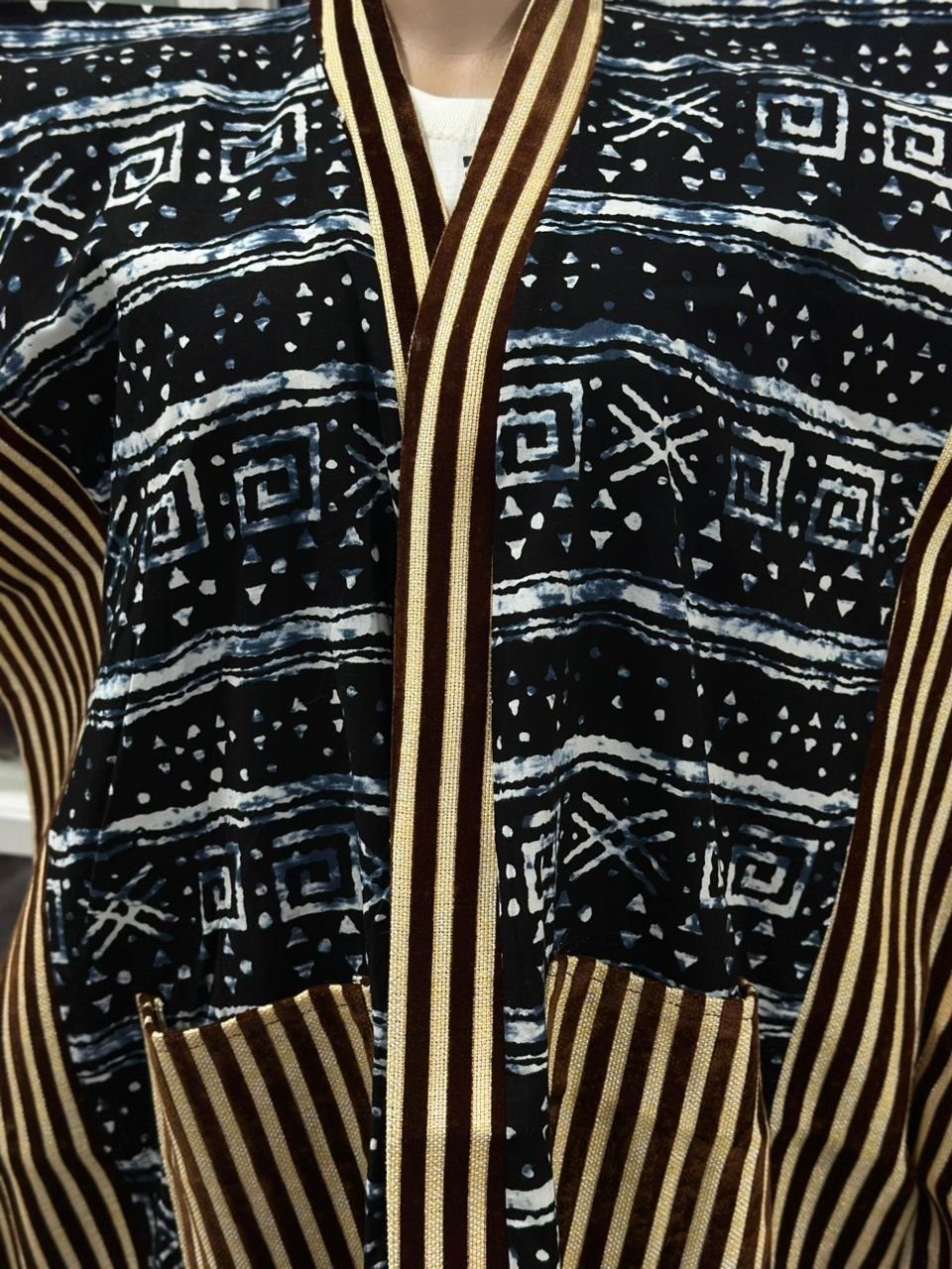 Celebrate tradition with elegance in this striking women’s two-piece African outfit. Featuring a sleeveless tunic with bold, flared shoulders and handy front pockets, the set is complemented by matching straight-cut trousers. The ensemble showcases a beautiful fusion of rich black mud cloth motifs and beige striped detailing, creating a look that is both cultural and contemporary. Perfect for cultural events, everyday style, or unique statement wear.